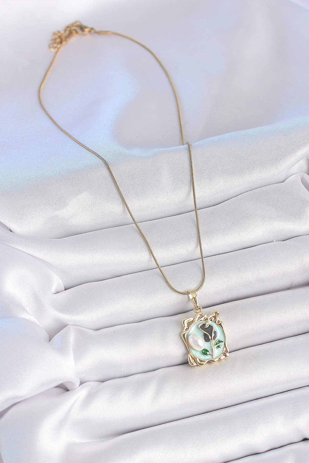 316l Steel Gold Color Chain Blue Enameled Flower Embroidered Pearl Detail Portrait Model Women Necklace