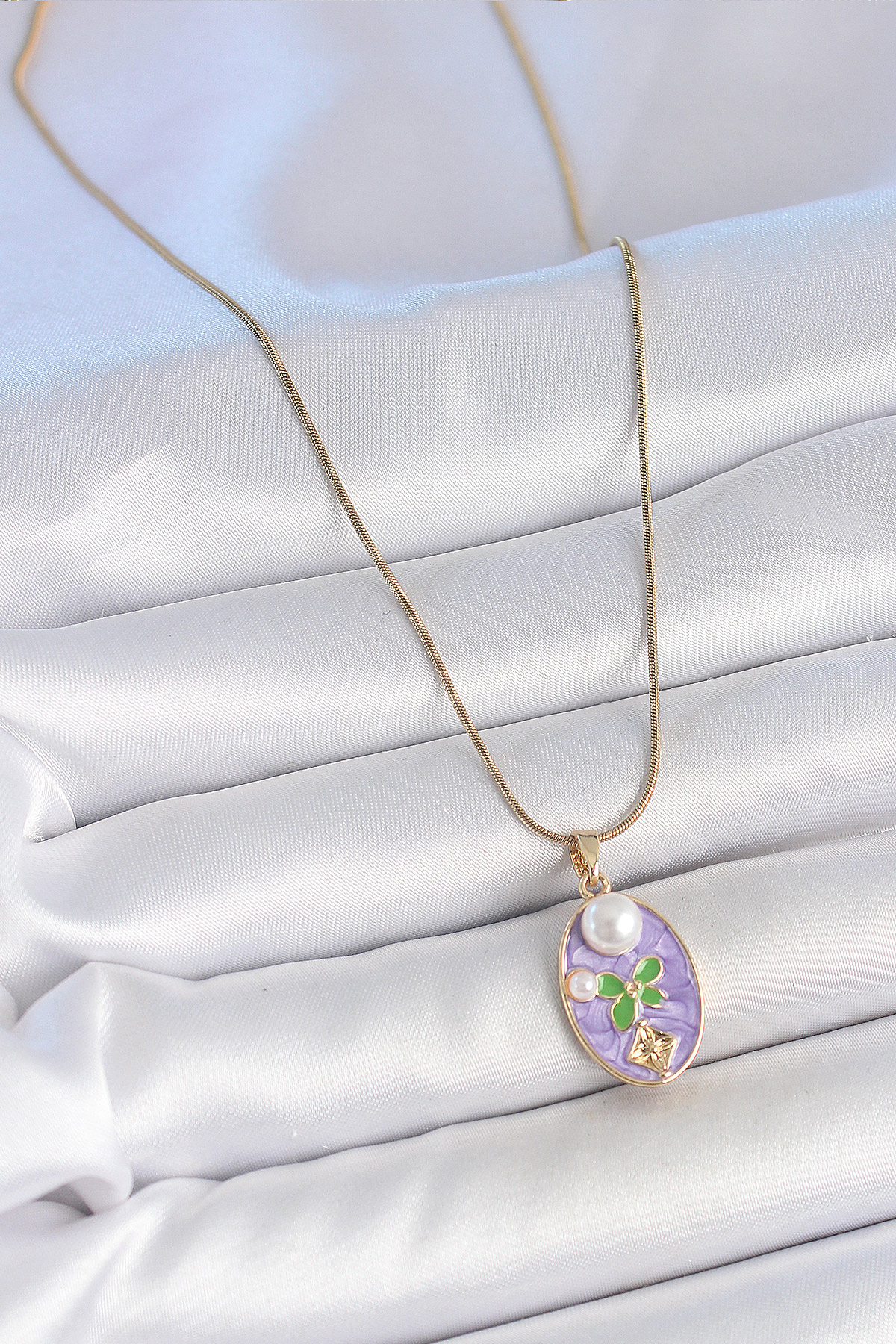 316l Steel Gold Color Chain Purple Enameled Oval Pearl Flower Embroidered Portrait Model Women Necklace