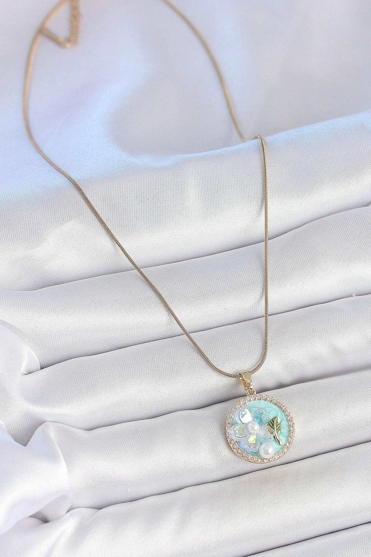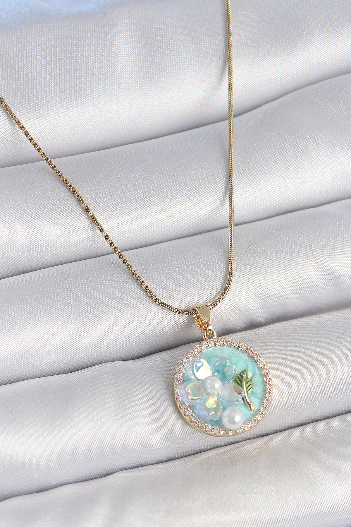 316l Steel Gold Color Chain Zircon Stone Detailed Blue Enamel Flower Embroidered Pearl Detail Women Necklace