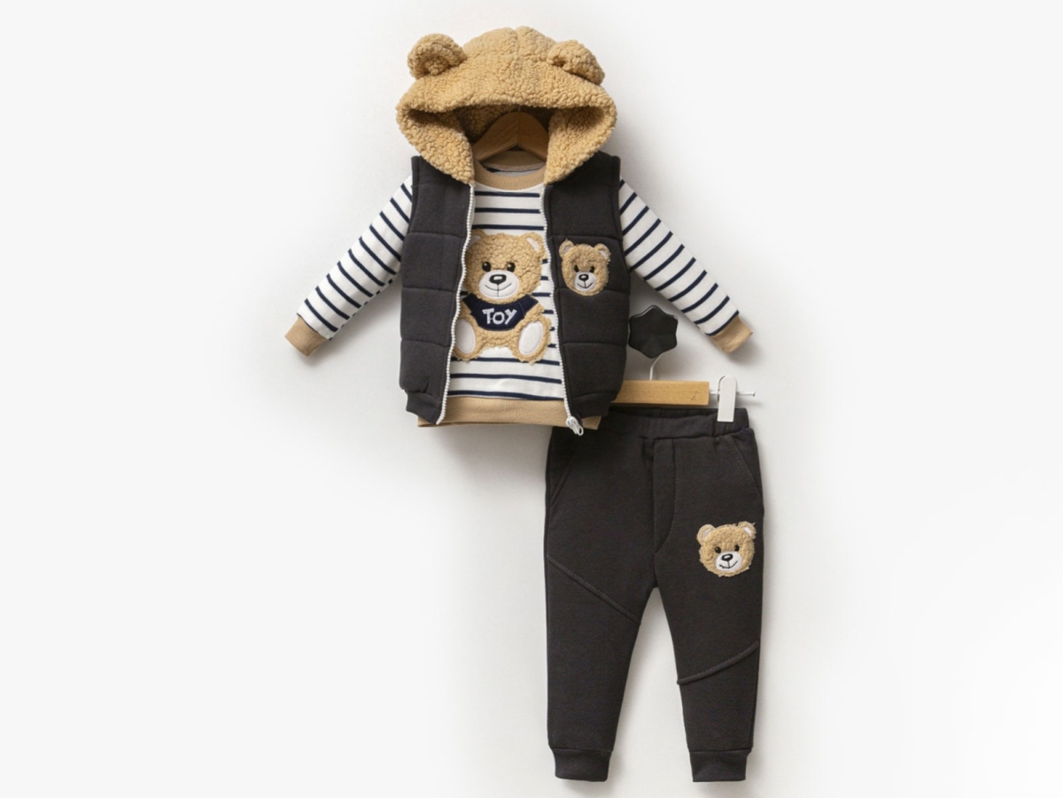 Baby Sets - B1 - Bear Embroidered Vest Three-Piece Unisex Set