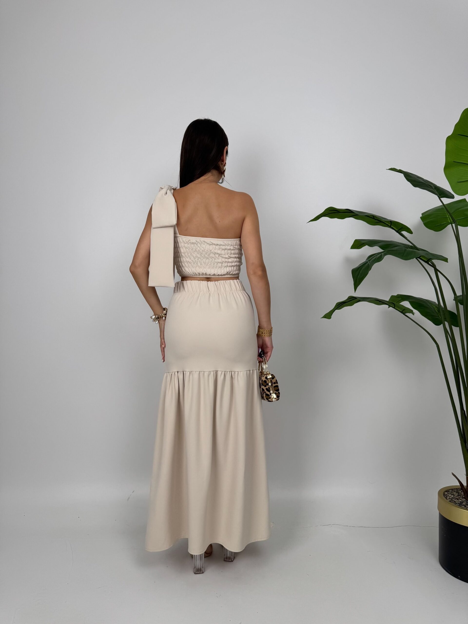 Beige Fit And Flare Maxi Dress With One Shoulder Neck