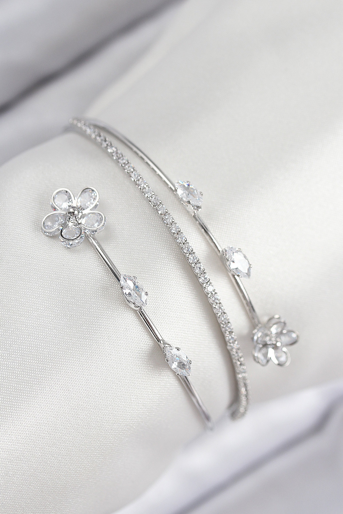 Brass Zircon Stone Flower Pattern Silver Color Women's Bracelet