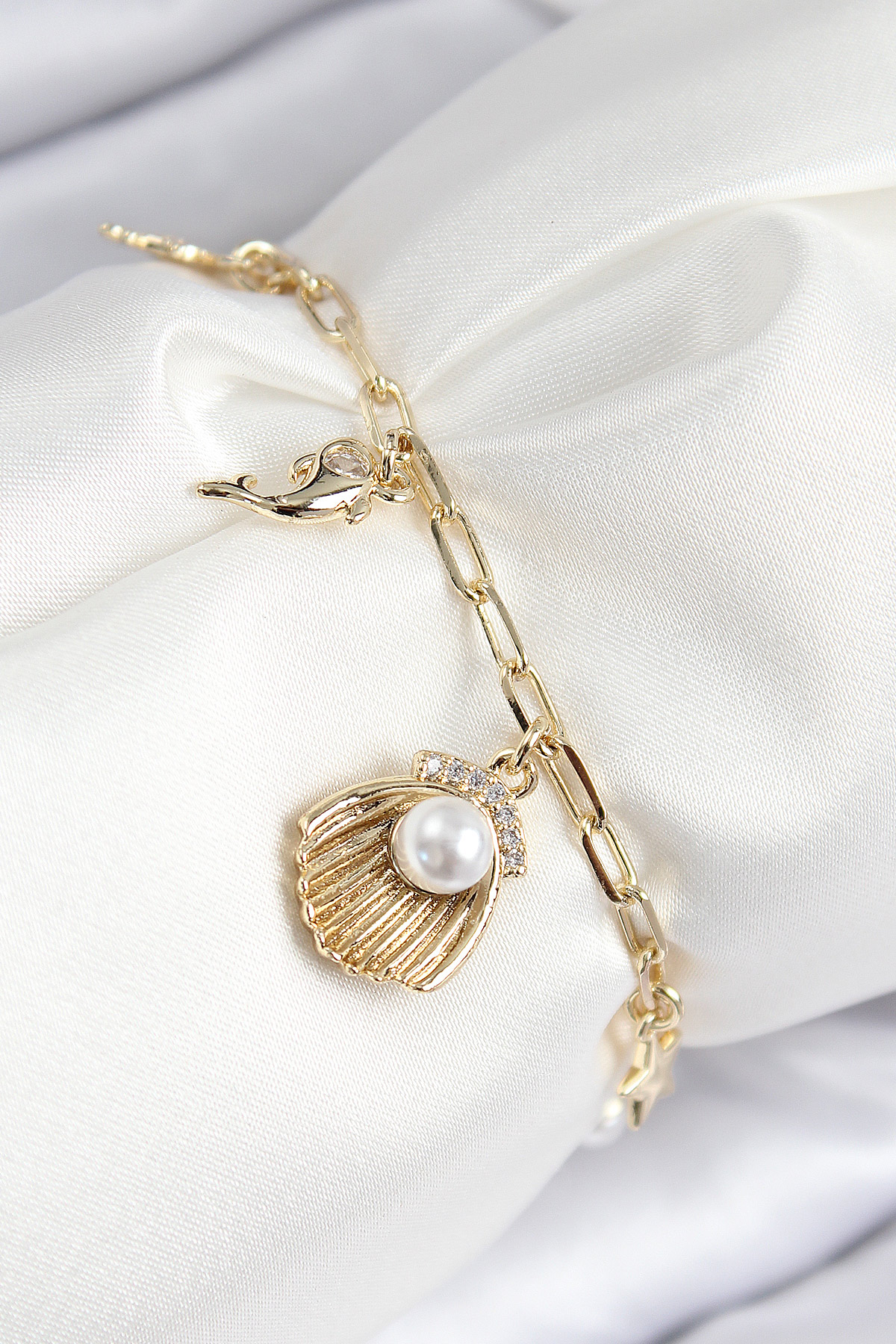 Brass Zircon Stone Pearl Oyster Pattern Gold Color Women's Bracelet