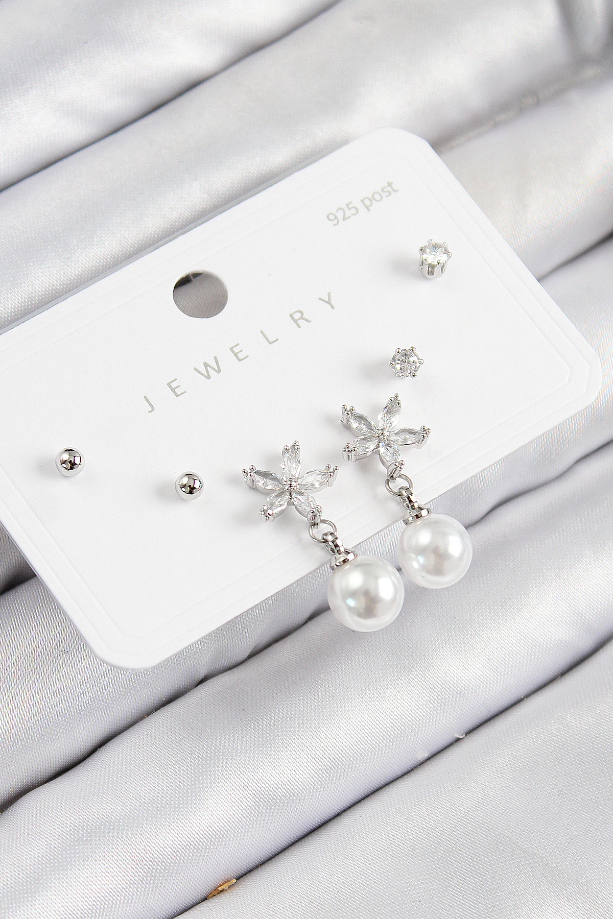 Brass Zircon Stone Pearl Swinging Flower Pattern Silver Color 925 Sterling Silver Nails Women Earrings Set