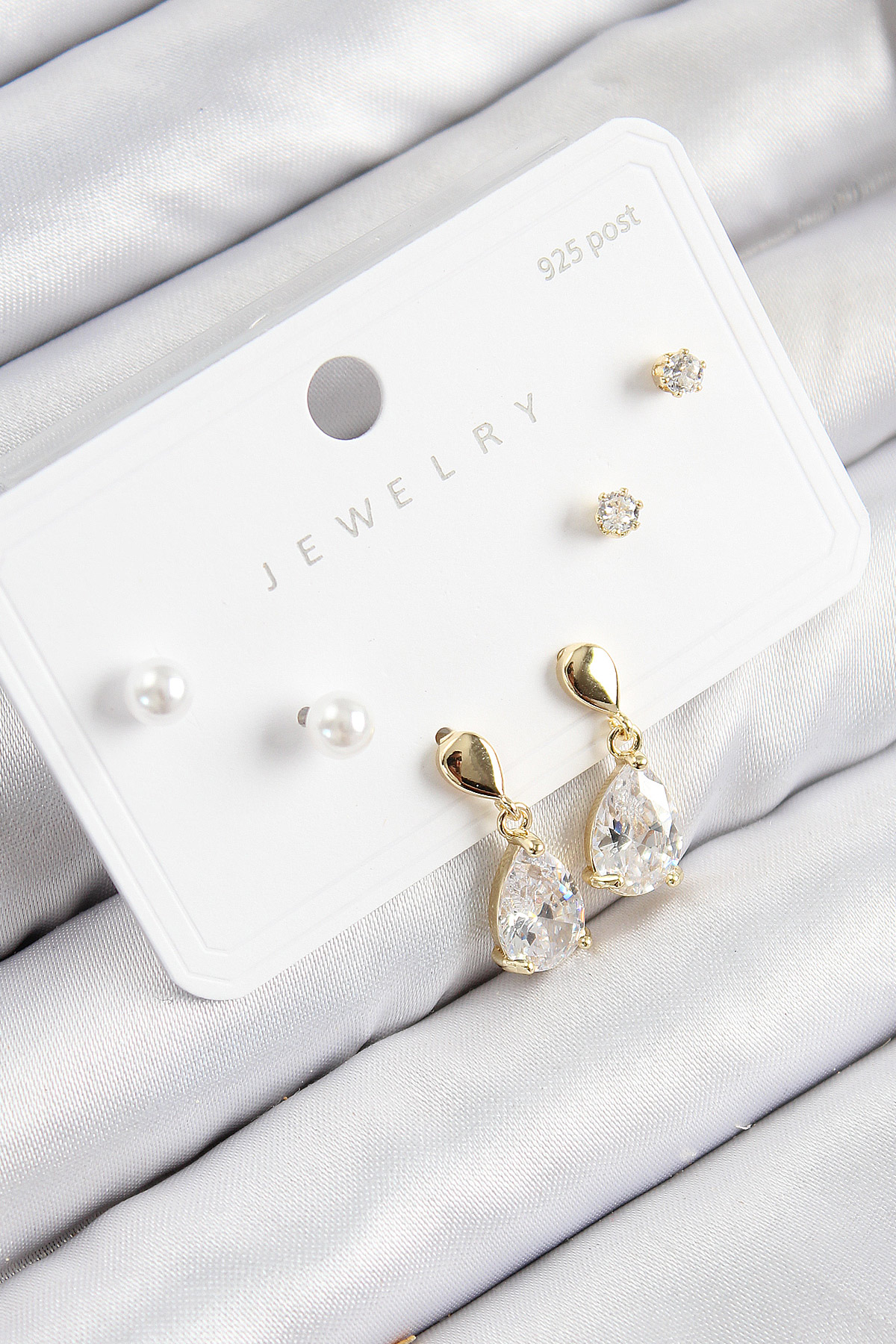 Brass Zircon Stone Rocking Drop Pattern Gold Color 925 Sterling Silver Studs Women Earrings Set