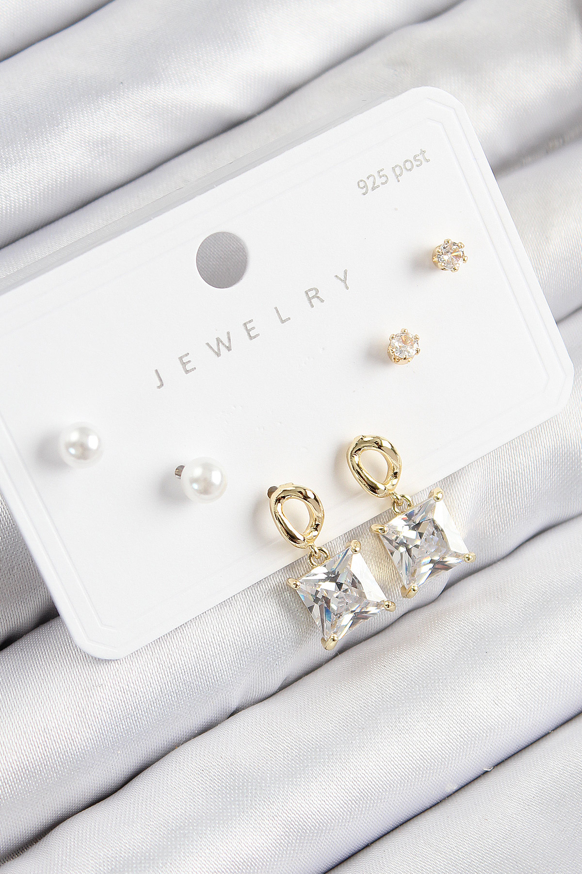 Brass Zircon Stone Swinging Square Pattern Gold Color 925 Sterling Silver Stud Women Earrings Set