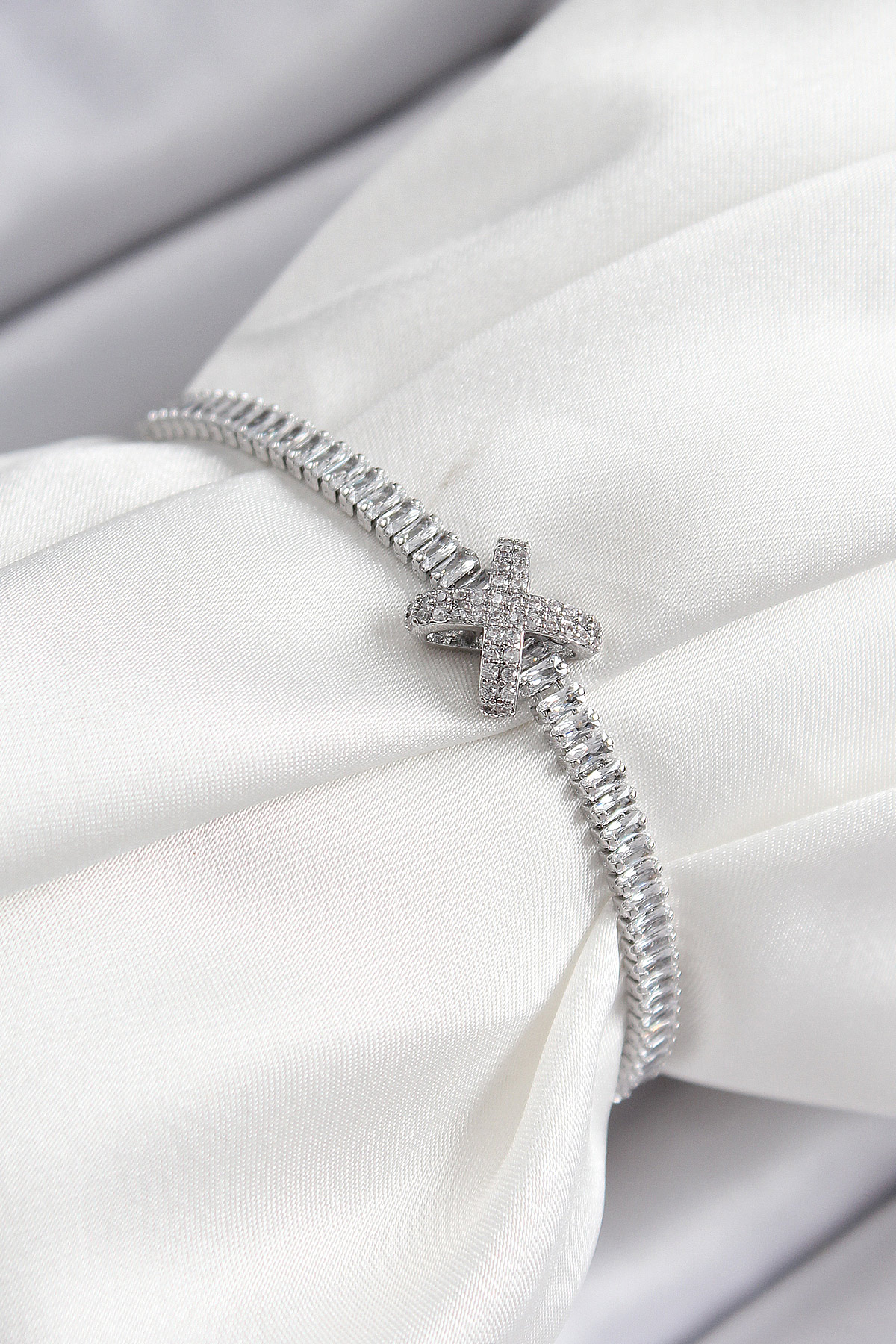 Brass Zircon Stone X Detailed Waterway Model Silver Color Elevator Women Bracelet