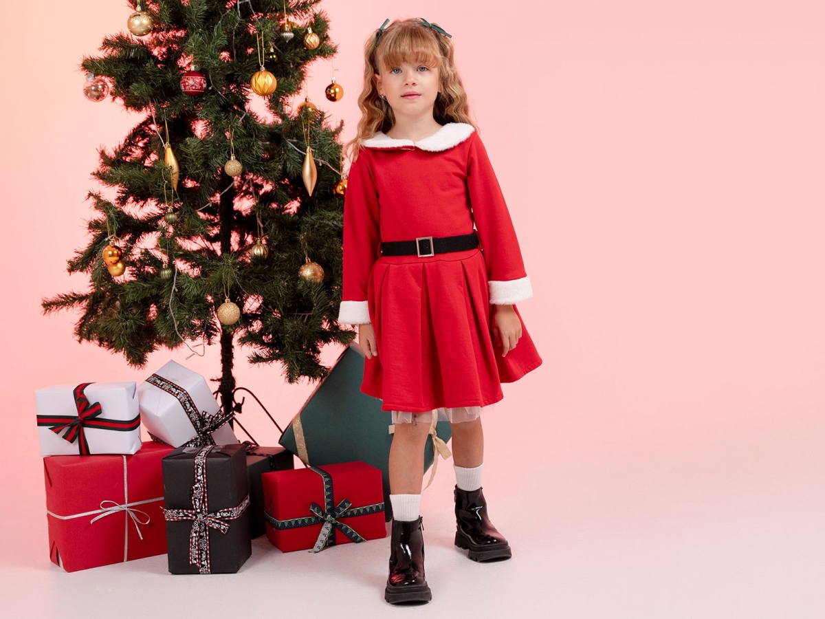 Girl's Dress - B1 - Collared Plush Detail Christmas New Year Dress