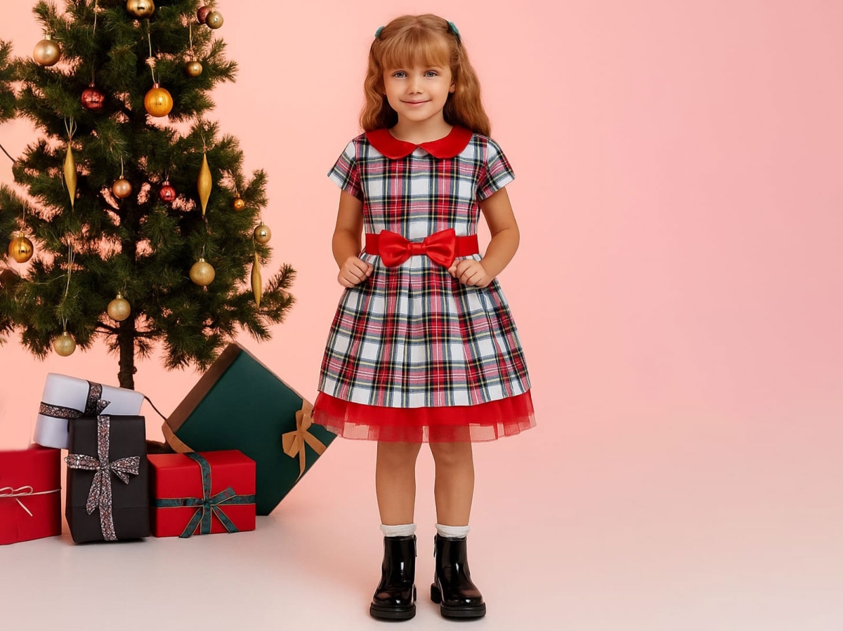 Girl's Dress - B1 - Plaid Patterned Bow Detail Christmas New Year Dress