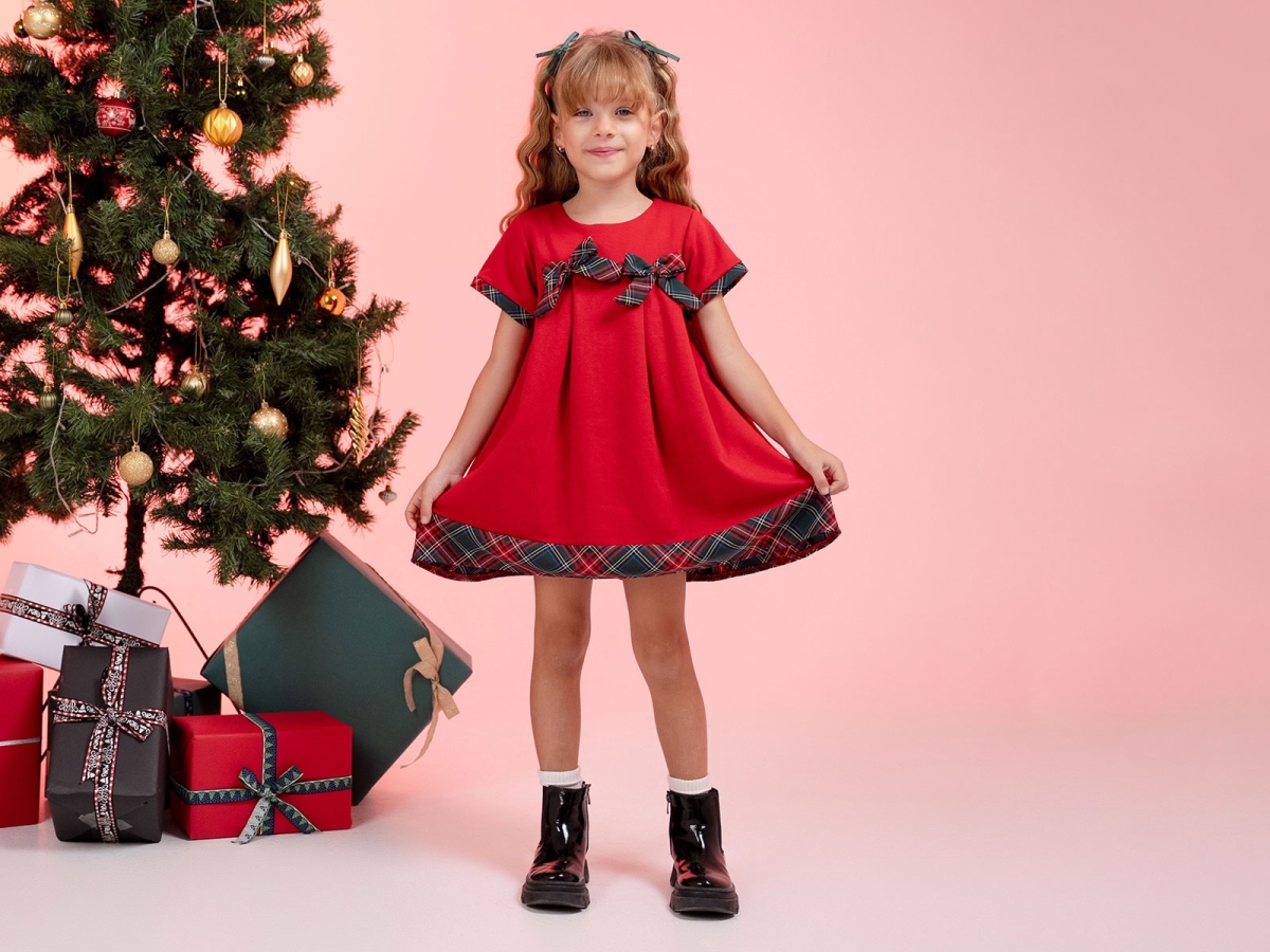 Girl's Dress - B1 - Plaid Patterned Bow Detailed Christmas New Year Dress
