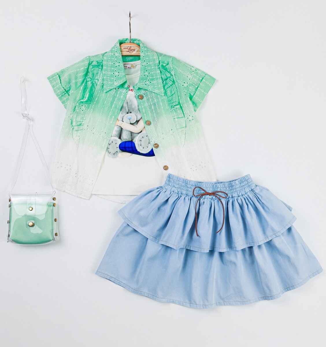 Girls' Suits - Wholesale 4-Piece Batik Embroidered Shirt Bodysuit Denim Skirt Bag Set 2-6Y 1055-5310