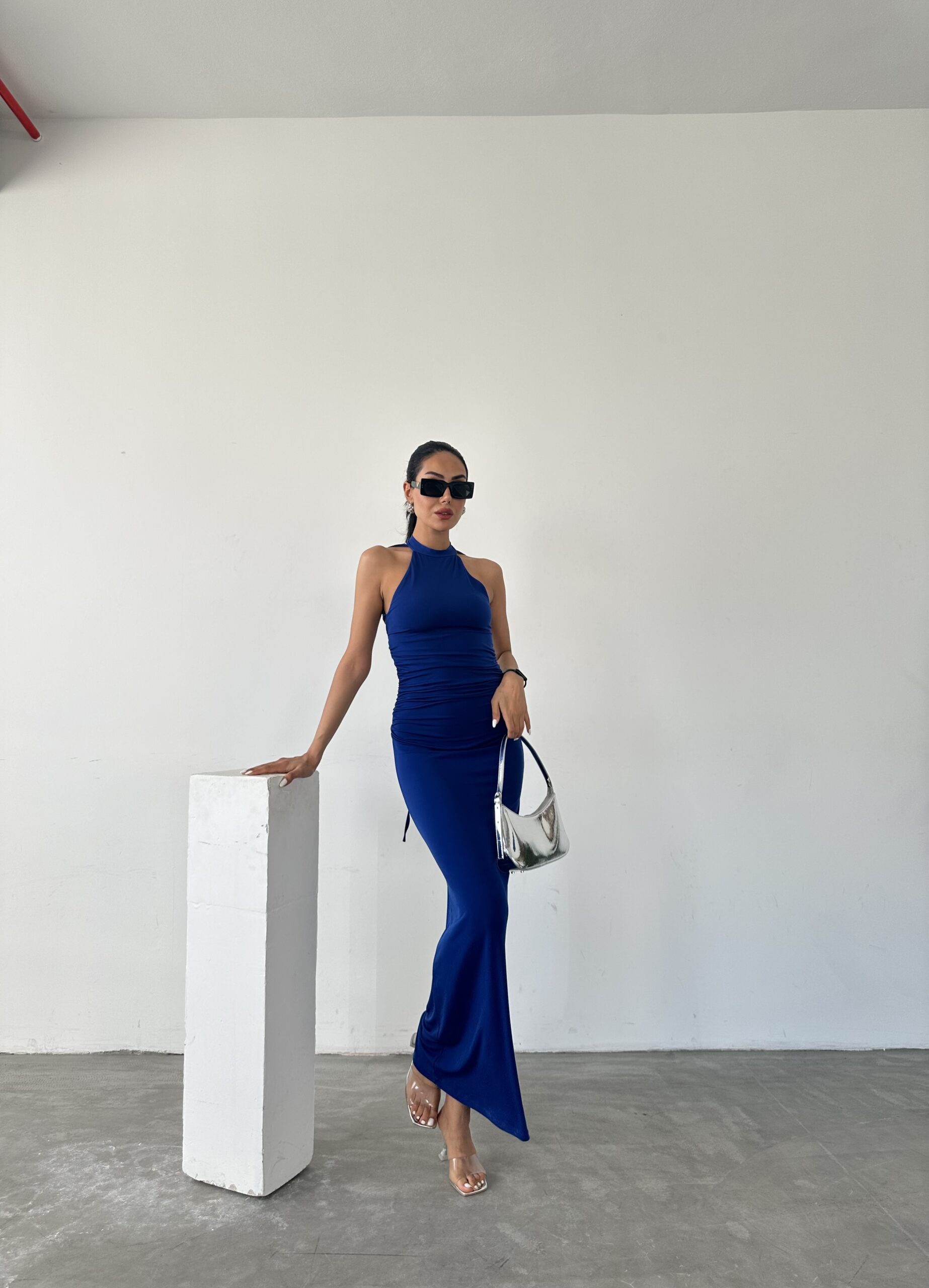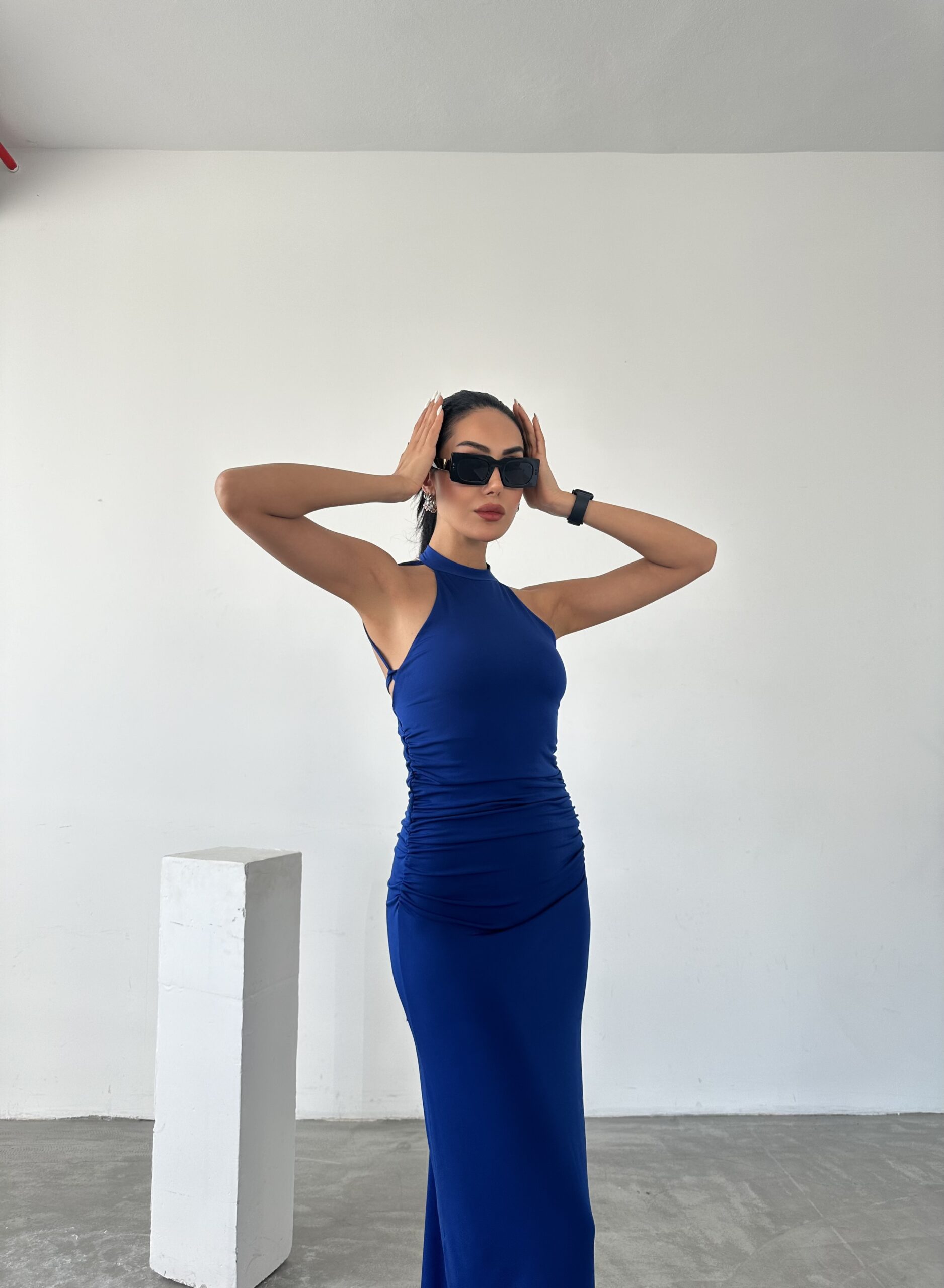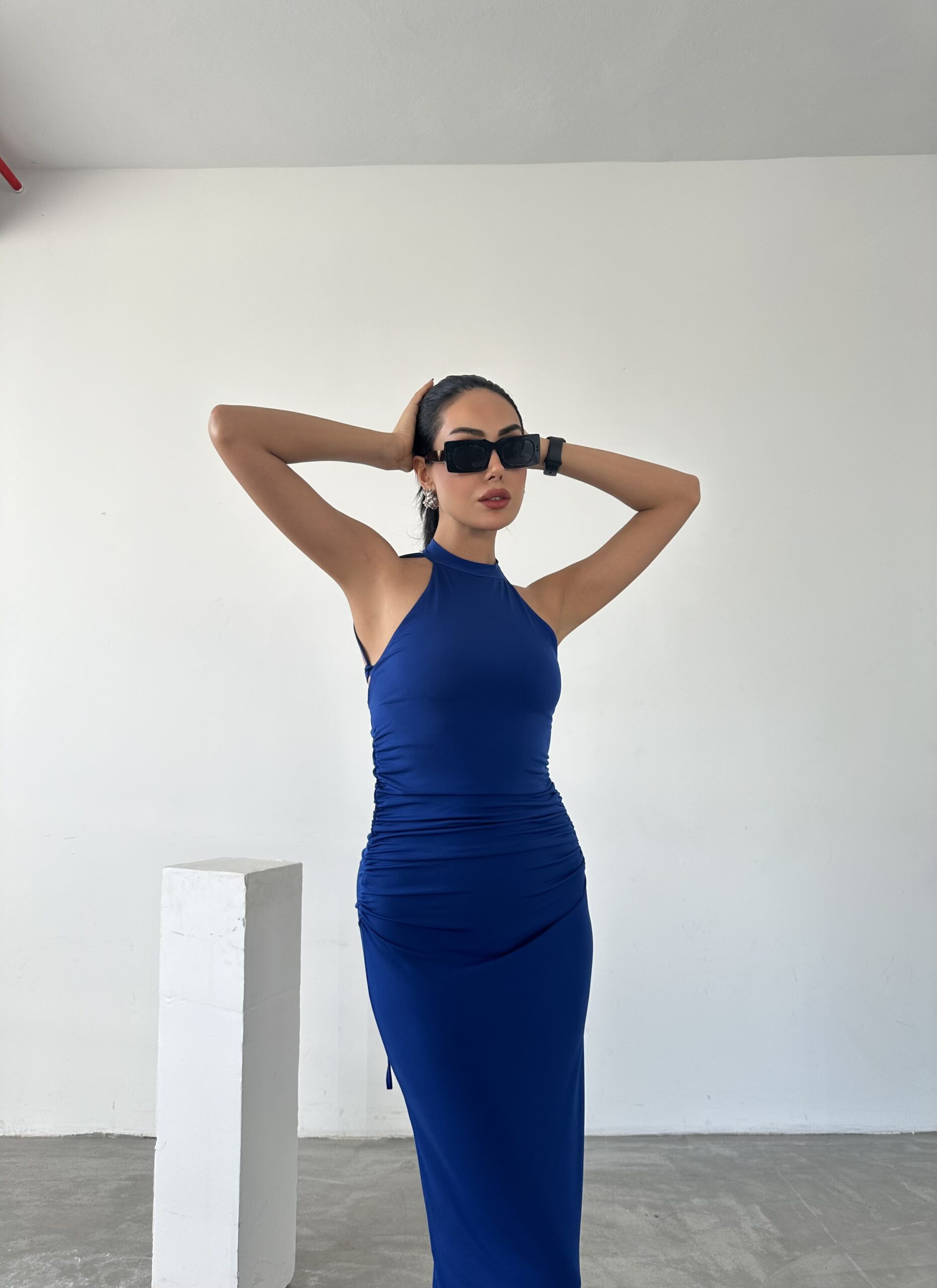 Halter Neckline Gathered Sandy Dress With Lace Detail On The Back