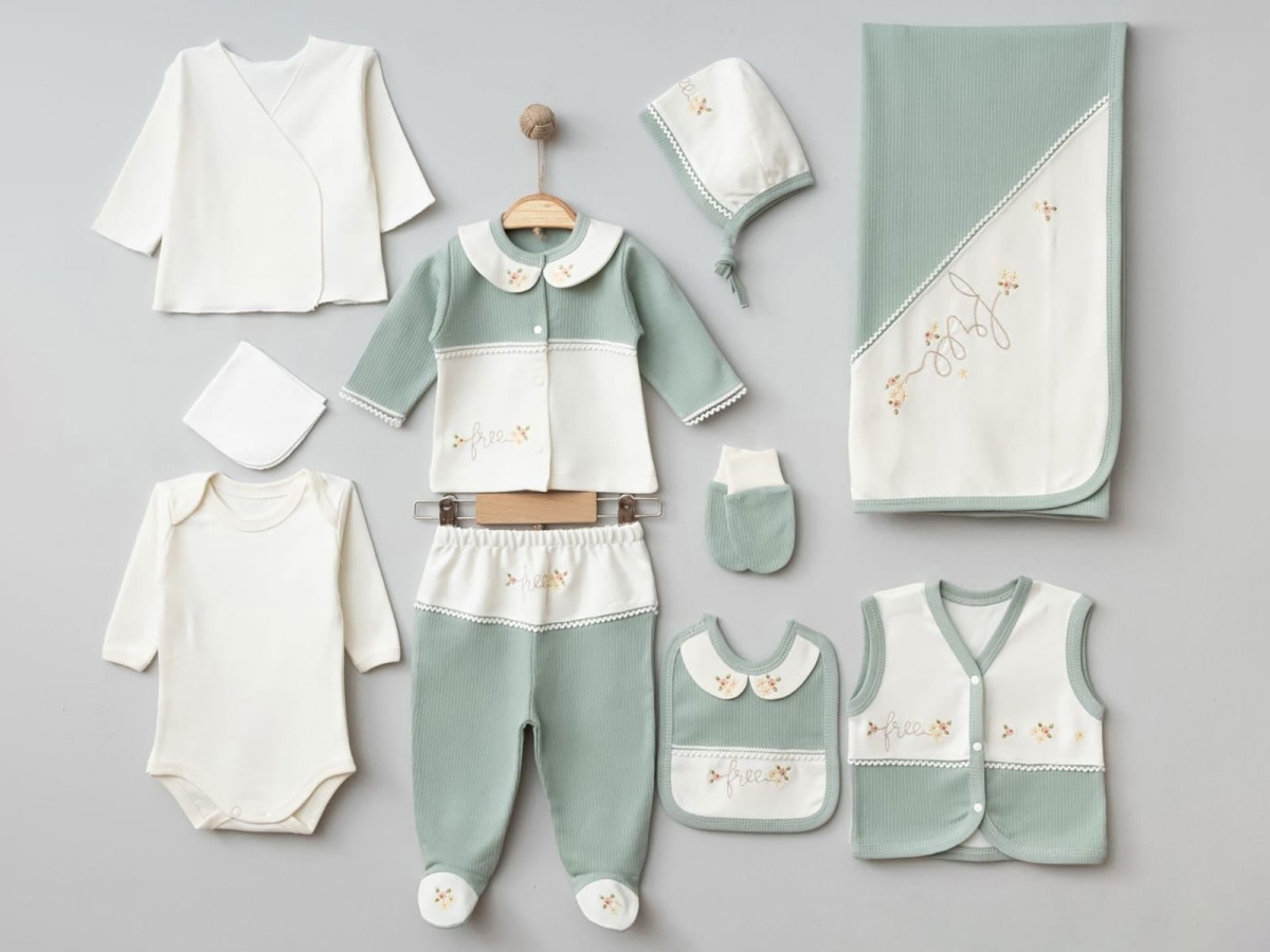 Newborn - B1 - 10 Piece Girl Baby Hospital Exit Set with Flower Embroidery