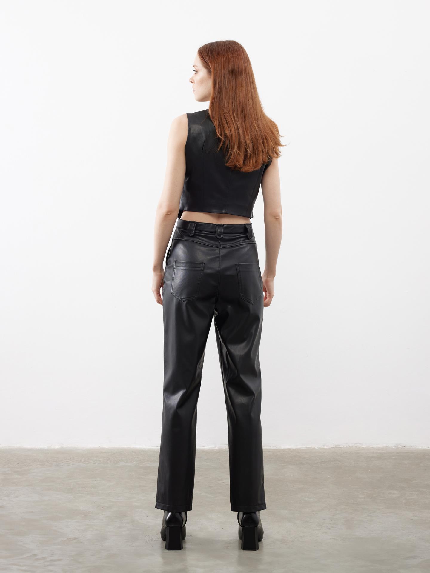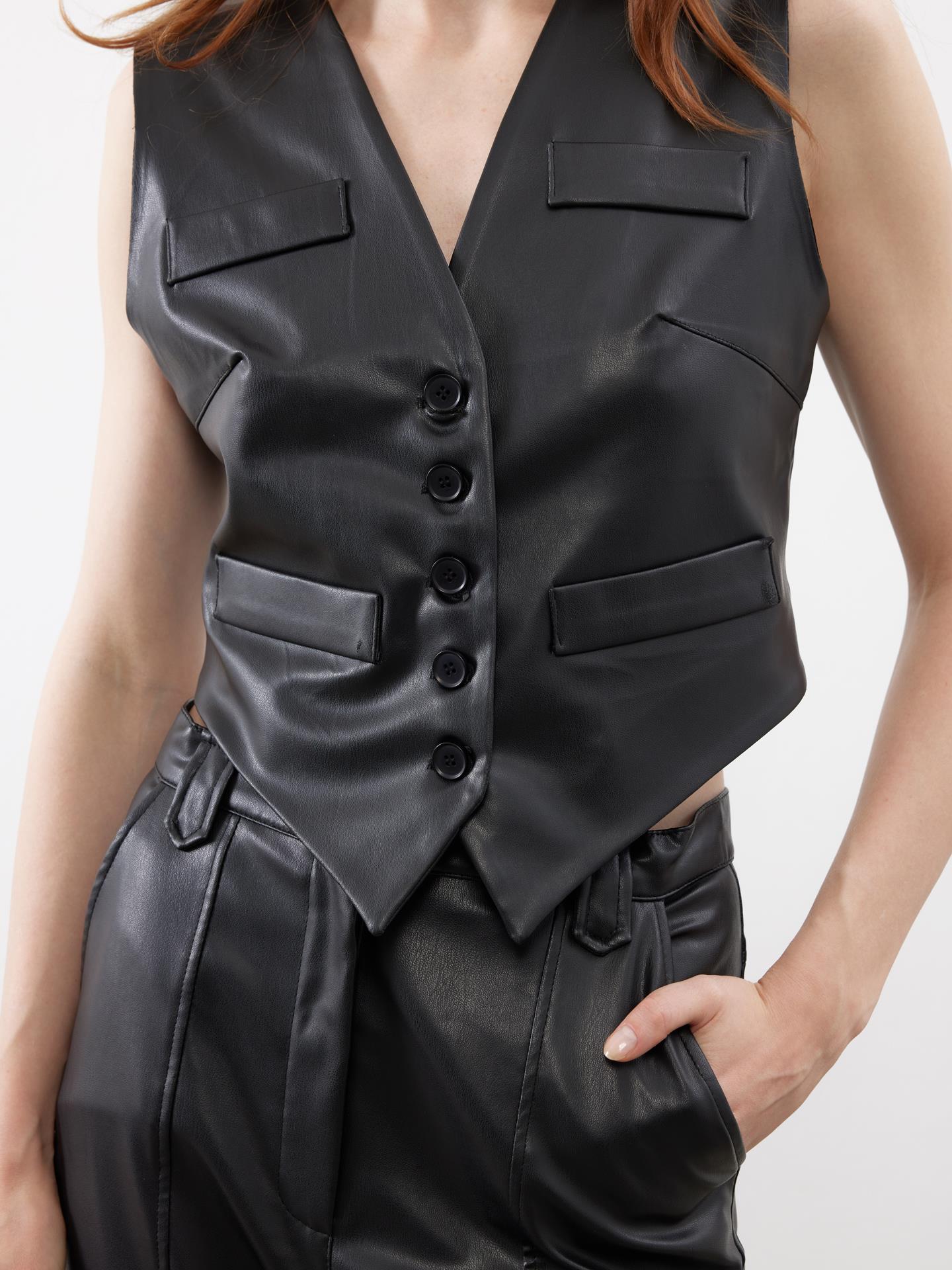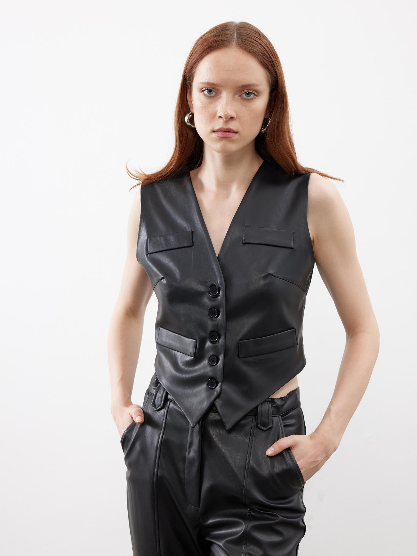 Special Cut Flannel Pocket Detailed Leather Vest Black