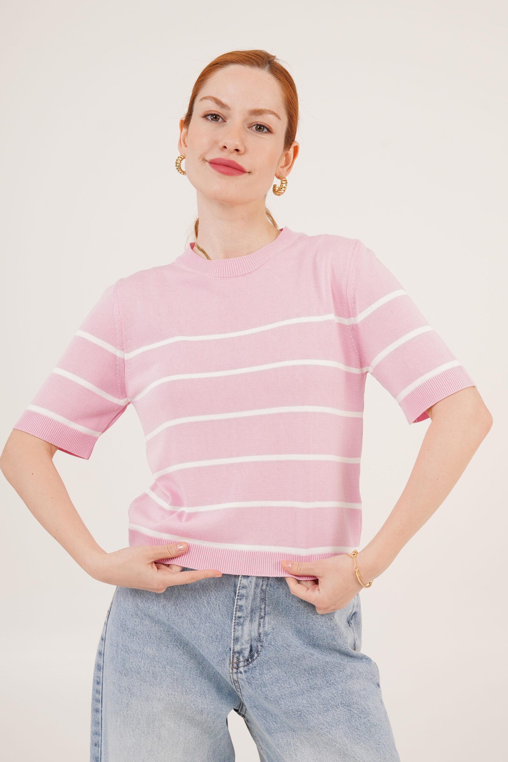 Striped Short Sleeve Pink Wholesale Blouse